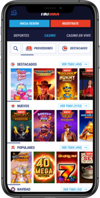 - Diseño y Navegación. La página de inicio utiliza un menú lateral izquierdo para Casino, Casino en Vivo, Jackpots y Promociones, mientras que el acceso a la cuenta se encuentra en la esquina superior derecha. La navegación entre secciones es directa, y todas las funciones esenciales aparecen en la pantalla sin requerir pasos adicionales.